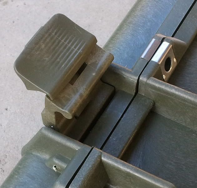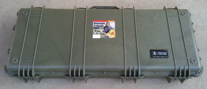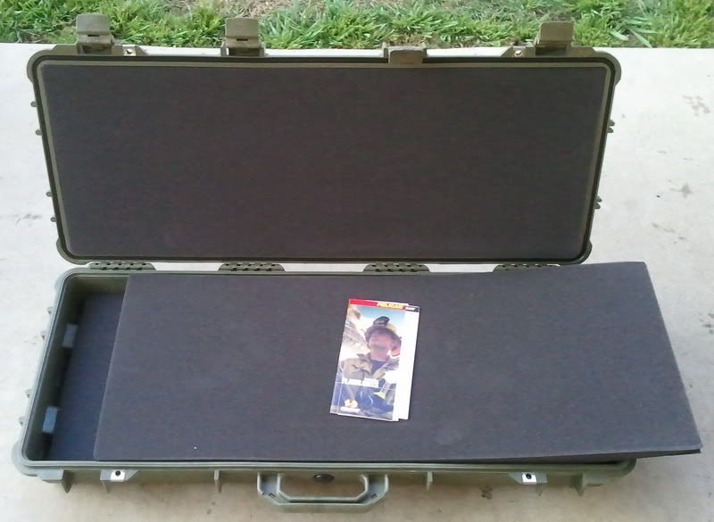 NIB. Box was opened for photos. New style, articulated latches make for easy opening and closing. Lock areas reinforced with metal. Includes three layers of "cut to fit" foam. (NOTE: this is not pick & pluck foam). Wheels on one end, handle for rolling on the other. Olive Drab. Outside measurement is 39 x 6 3/16 x 17 5/8