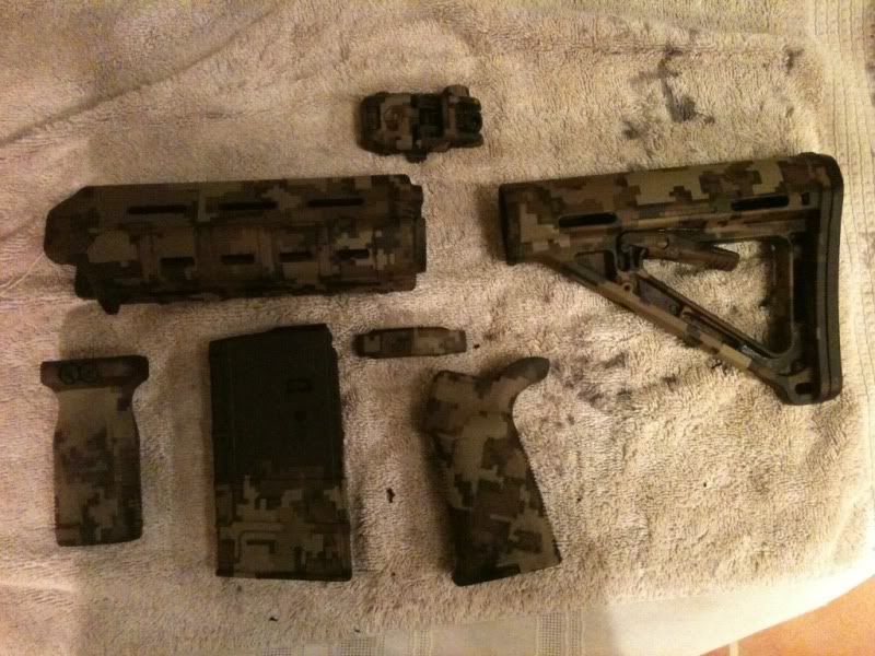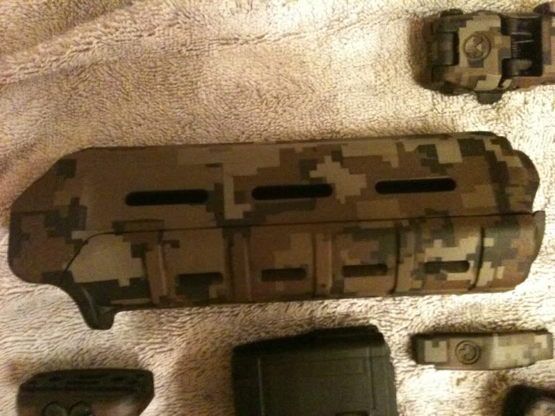 Howdy, I do custom furniture designs for guns using an infusing process. What that means is that the color is permanently embedded in the polymer and will not come out unless you actually cut into the polymer. So no more worries of scratches or dings and flaky or peeling paint. I have a very long thread showing all the designs I have done if you are curious to see more. I am selling this as a set, so please do not ask to separate. Also this is completely custom and one of a kind so no one else in the world will have these colors or exact design.