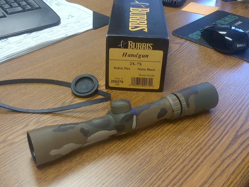 Up for sale is my used 2-7x32 Burris Scout Scope with Ballistic Plex BDC reticle. Specs can be found here: http://swfa.com/Burris-2-7x32-Handgun-Scope-P3298.aspx I have had it mounted on my M1a Scout for about 300 rnds. Eye relief is 21"-10" so it is designed for a handgun or scout set up. The Optic is Duracoated in Multicam by Larson Tactical and can be seen on the bottom of their page here: http://www.larsontactical.com/id33.html The scope does have some ring rub on it (see pics) but is fully functional. $175 Shipped OBO.