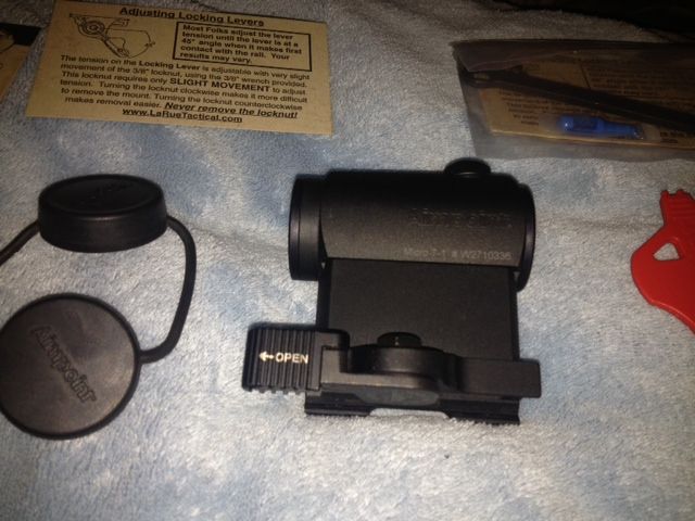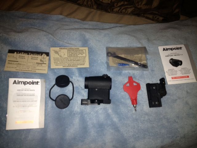 IM SELLING A AIMPOINT MICRO T1 ONLY BEEN MOUNTED NEVER BEEN TOOK OUT TO A RANGE COMES WITH TWO MOUNTS BOTH LARUE ONE MOUNT IS THE 1/3 CO WITNESS WITH QUICK RELEASE LEVER AND THE OTHER MOUNT IS THE LOW MOUNT ALSO WITH QUICK RELESE LEVER AND IT COMES WITH MANUAL AIMPOINT TOOL AND BIKINI COVER CAN MEET LOCALLY PREFER NOT TO SHIP IM SAN BERNARDINO PLEASE PM OR I CAN TEXT YOU PICS 600$