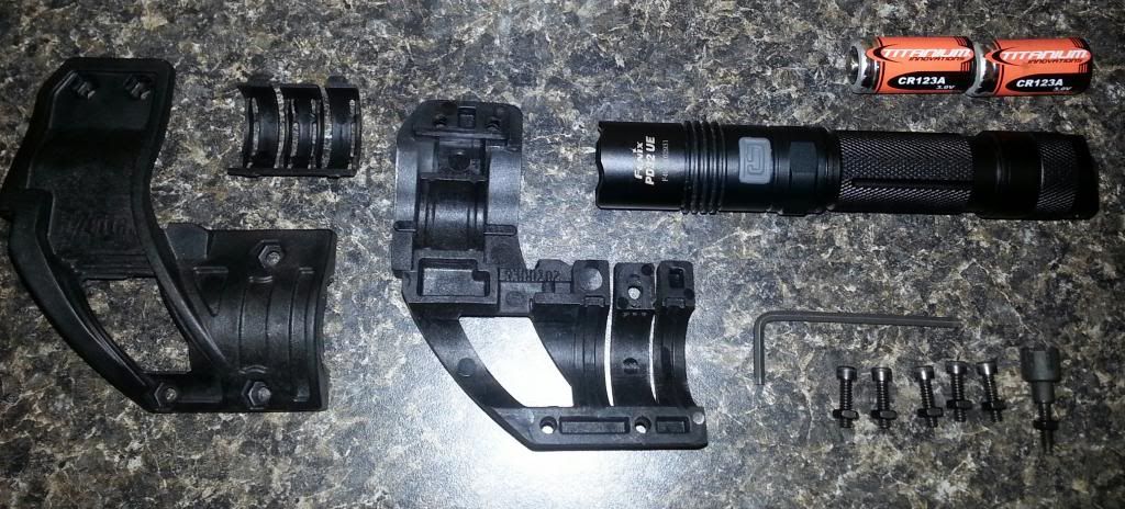 flashlight (PD32 UE) comes with 2 batteries and the mount comes with the thumbscrew