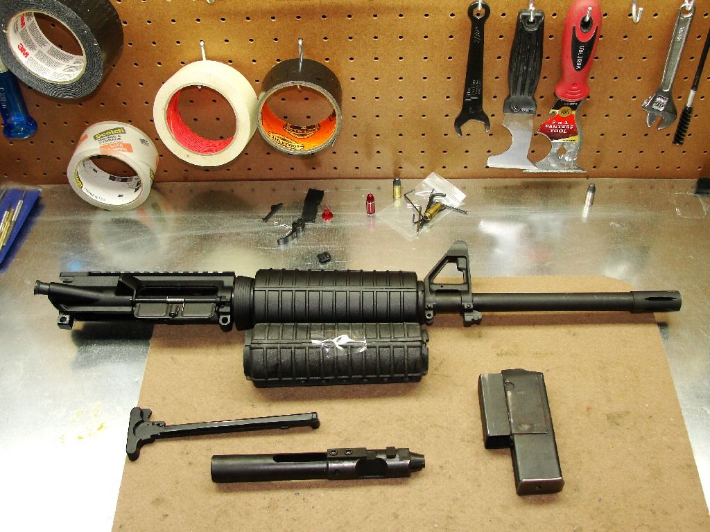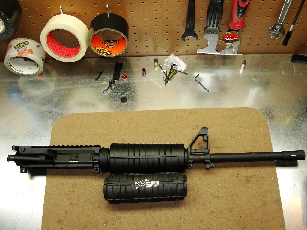Comes with an extra hand guard (thin style) and one ten round (older style) Olympic Arms mag. I spoke with Olympic Arms today and they said it will work fine with their new polymer 9mm mags.