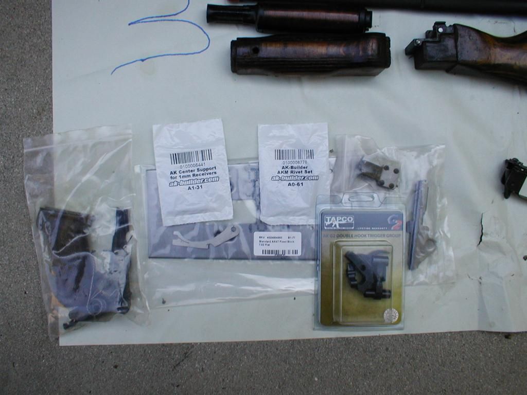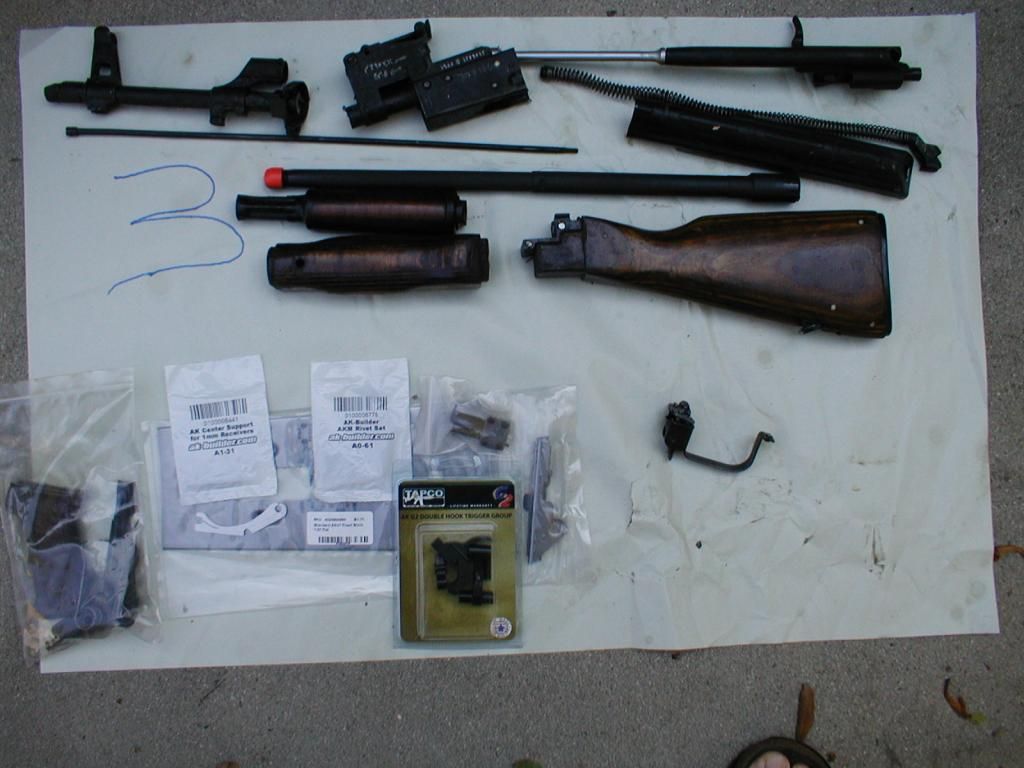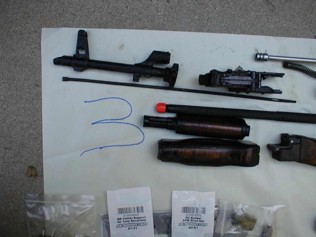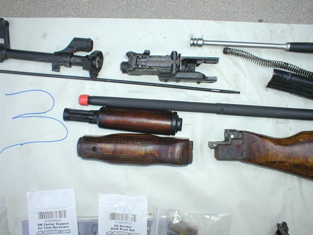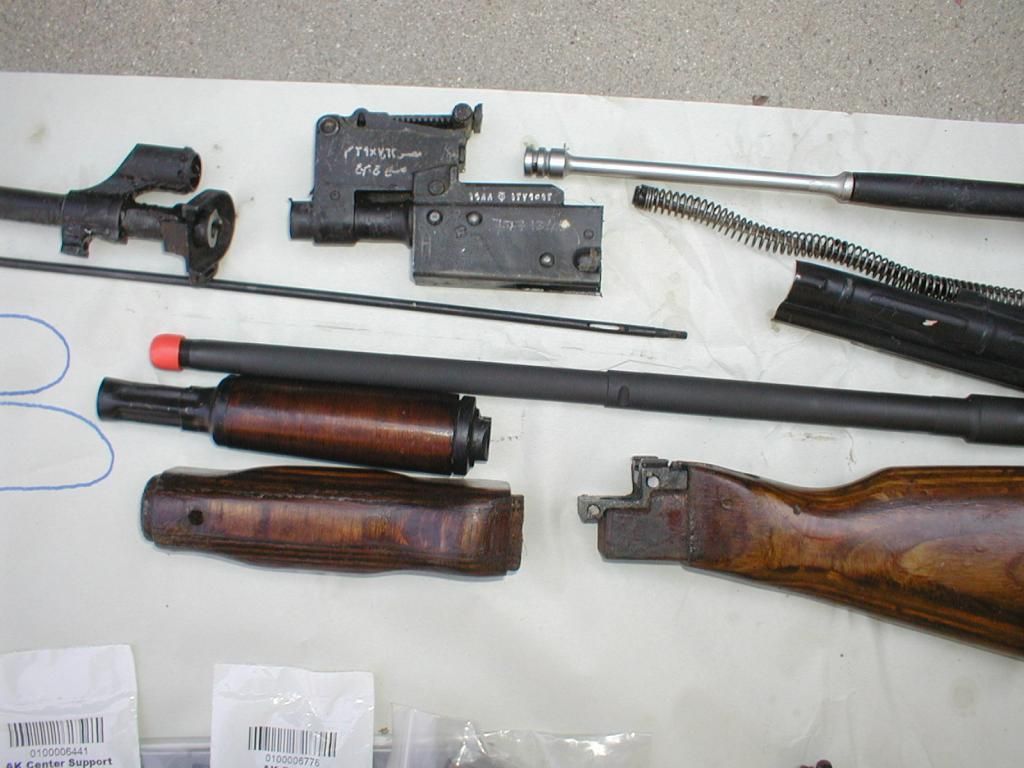 I meed an AR upper. In addition to this kit I also have some kits with populated and headspaced barrels. PM me, I'll post more pics later. This 7.62x39 kit is marked in Arabic; trunion, rear sight base, sight leaf, dust cover, and I think the recoil spring is also. I'll double check. The bolt and bolt carrier numbers match, they are marked in conventional numbers. The Arabic numbers on other parts don't match but I'm not sure why anybody cares about that when they are in Arabic and you're using a new barrel anyway. The kits look like they were very close to new when they were cut up. The wood furniture looks good. While crutch folders are a novelty the fixed stock is much better for shooting. The barrels are from a recent batch that AKBuilder had, they sold out in hours. Everything needed to build a rifle is here including receiver flat, rivets, center support, G2 trigger group, retainer plate, mag lock. I washed the grease off and a lot of the crappy paint came off with the grease. An Egyptian kit is as close as you can get to a real Russian kit but they really didn't care about the paint. It was strictly for corrosion protection. Before I build mine I will finish soaking all of the paint off. $750 If this sounds like a lot of money do the math and include all the shipping costs as you order all the parts that are often sold out when you want them.