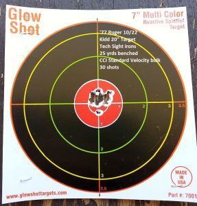 I'm selling on my 20" Kidd bull barrel (.920"). I bought it new from Kidd on 7/13 of this year and have put exactly 100 rounds of CCI Standard Velocitys through it. Here's what it was able to do at 25 yards with iron sights; these were the last 30 rounds of the day.