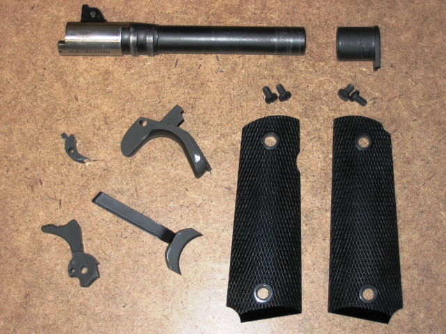 I fired ~400 rounds through my Milspec before changing out these parts. Includes original barrel w/MIRROR finish inside (don't have the link thingy but the pin is there), barrel bushing, grip safety, trigger, hammer, sear, and stock grips with screws.