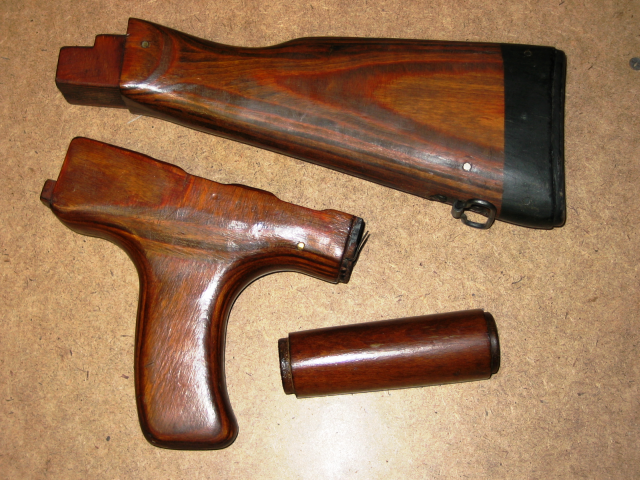 This kit is in good, but slightly worse shape than the next one, with finish flaking in some places on the handguards only, upper handguard is the roughest. Includes 2 of the foreign-made pistol grips shown in the photo following Item #5 (your choice of grips; first come first served).