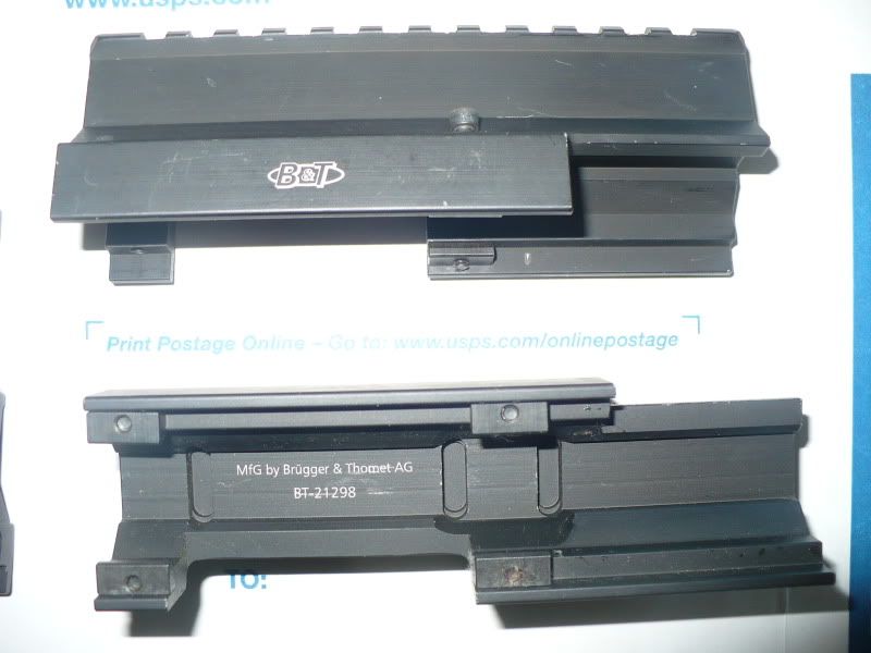 B&T Optic mounts for H&K MP5 H&K 91 H&K 93 H&K 94 PTR 91 # BT21298 designed to fit all variations of MP5 as well as the HK91/93/94 will also work on PTR91 this lets you mount optics like a Eotech / Aimpoint or other red dot or scope yet has a peep hole through the base so you can still use your iron sights used but good condition retail was over 205$ new plus 10$ shipping PLEASE NOTE THIS IS THE STRONGER OLDER DISCONTINUED VERSION NOT THE NEW CHEAPER 2 PIECE MODEL http://www.eurooptic.com/mp5-mid-ran...-BT-21298.aspx : 125$ obo