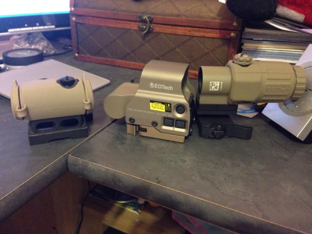 I have a lightly used Aimpoint T-1 2moa with tango down FDE cover and your choice of ADM tall mount or Larue HK mount. I am asking $575 shipped. I also have a FDE Eotech expos 3-2 with a fde g-33 magnifier I selling for $950 plus shipping. The eotech was purchased from weapons outfitter 2 months ago and the magnifier was purchased off arcom. I have the cases for bot items. Let me know if you have any questions. I am selling these optics to fund a fde elcan so I am not looking for any trades.