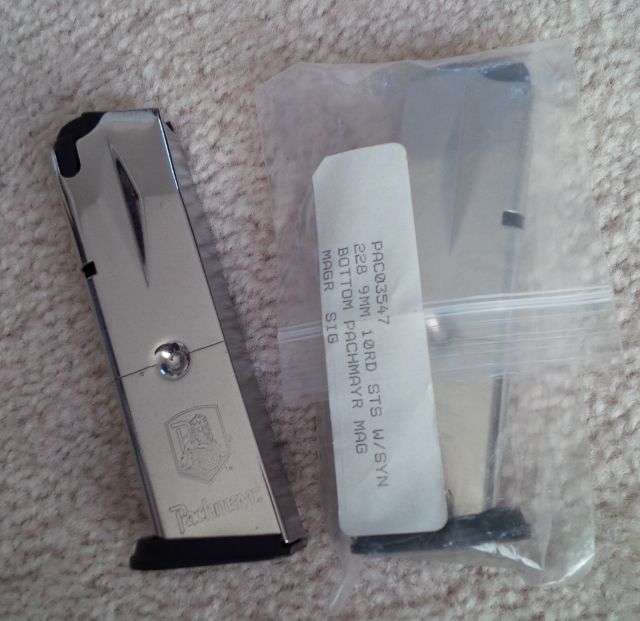 Two new Sig P228/P229 Stainless Steel 9mm 10-rd magazines, Pachmayr brand. Both are unused, one is still NIW. All metal body doesn't have the plastic body extension seen on many Sig 10-rounders. I found these in the back of my safe, had forgotten about them. Selling as a pair, $45 FREE shipping. Discreet PP preferred, you cover fees.