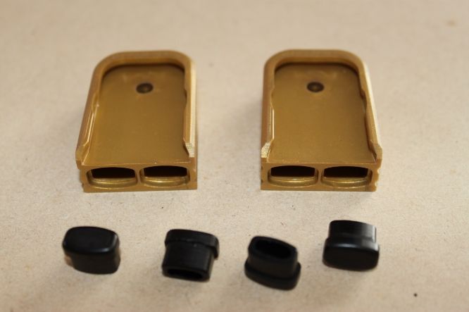 for those who are interested, i'm selling some extended magazine bases for glock small frame (9mm, .40, .357) magazines. these are about three times as tall as the factory magazines. these are also about 1/10 of an inch longer. these are really helpful if you're using magwells. these are molded plastics with hollow cavities. the cavities can be filled to add extra weight if one desires. these mag bases provide more gripping surface necessary for tactical and/or competition use. sorry, these do not add capacity. these come with plastic covers that fit really snugly into the whole. these will fit all small frame glock magazines, but will not work on the subcompacts (g26, g27) because of the extra length. made right here in California.