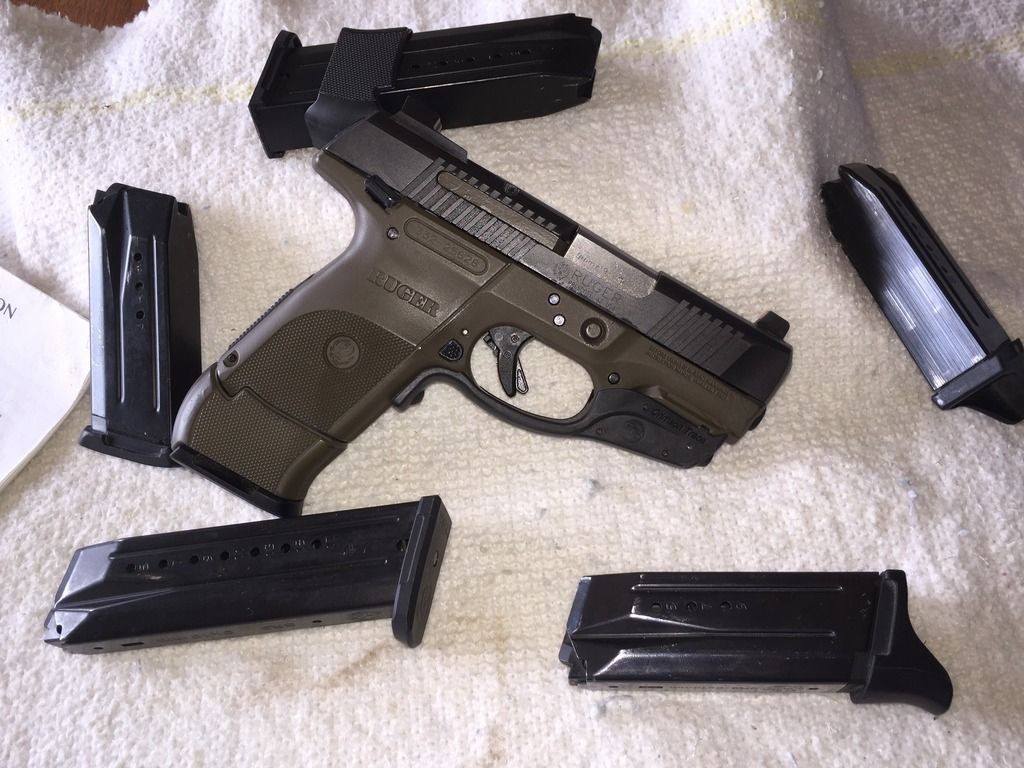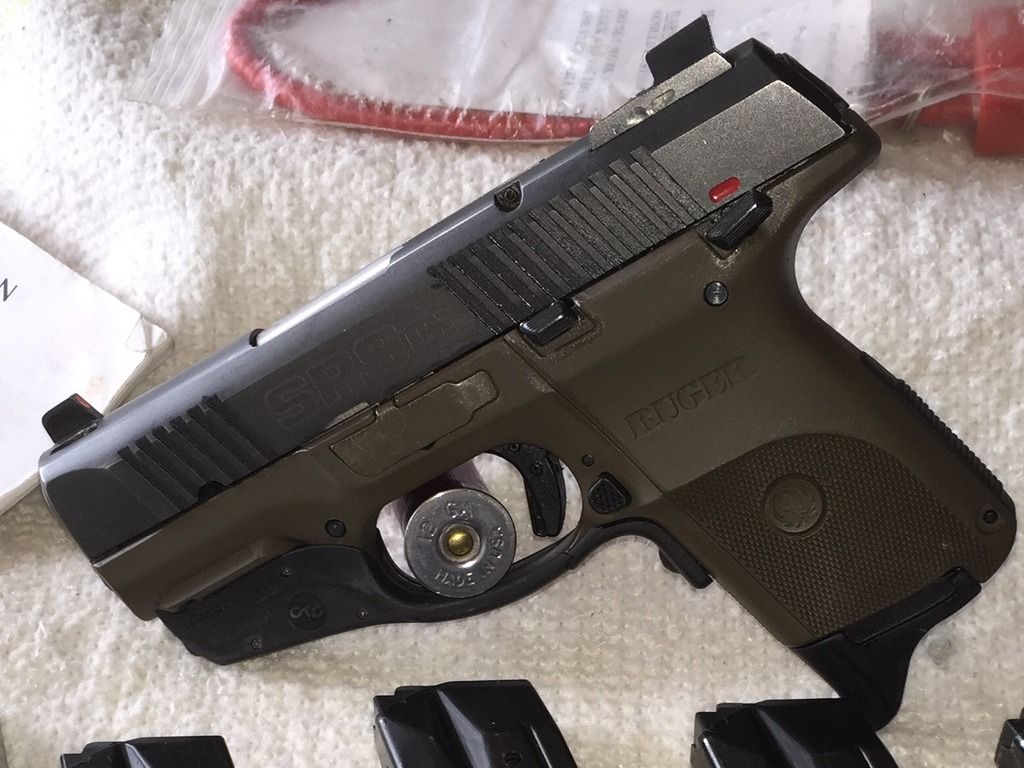 This is an excellent GUN!! Fits the hand perfectly and with the Crimson Trace Laser $250 value,it's the perfect CCW. A VERY THIN GUN AND EASY TO CARRY. This Ruger has Trijicon HD NIGHT SIGHTS $150 value and mag extensions to give a full grip. 4-10 round magazines and 2- full size regular capacitymagazines. The gun has a very nice dark FLAT DARK EARTH FRAME AND BLACKENED STAINLESS SLIDE