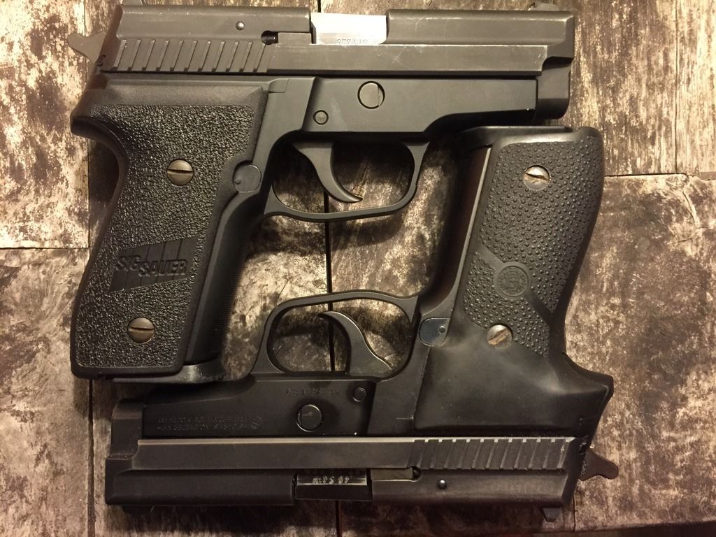 Up for sale is a pair of German framed triple serial P229's. One is in .40 S&W and the other is .357 SIG. The P229 was the first SIG to be released in .357 SIG and both date from the mid 90's. Though there is no difinitive stamped date code to date these models, there is a well informed datum on SIGforum.com of serial numbers corrisponding to dates of manufacture. The P229 in .40 S&W comes with a pair of Hogue grips in addition to the factory OEM. Neither have had any modifacations done to them. Will send additional photos on request.