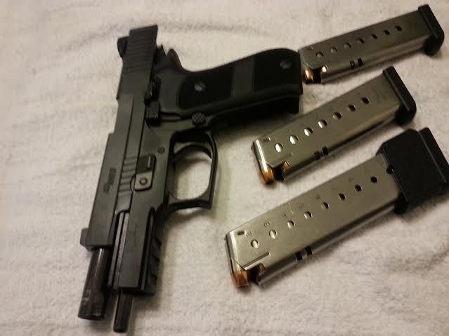 P220 Elite Dark = I'm the second owner. Original owner put 500 Rds through it and I have put 200. When I acquired the pistol it did not come with the case or paperwork. This gun has the Sig Sauer Combat Sights and SRT trigger. Comes with two 8 Rd mags and one 10 round.