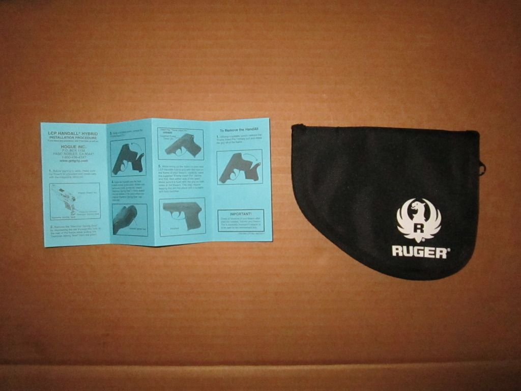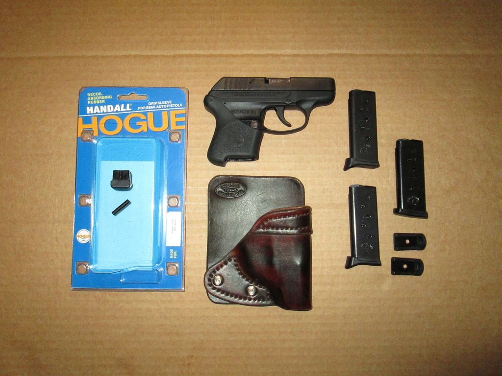 Other info: Up for sale is a Gen 1 Ruger LCP, in excellent condition. I'm the second owner, and I've put approximately 50 flawless rounds through it. The gun has been fitted with a Hogue Handall grip sleeve, but I'm including the original hammer spring seat and frame insert pin if the new owner would like to remove the Hogue grip. Included are three factory magazines (two with pinky extender floor plates installed, along with the original flat magazine floor plates), soft nylon factory case, and a Red Dog Gun Leather pocket holster. Also included but not pictured are the original factory lock and instruction manual.