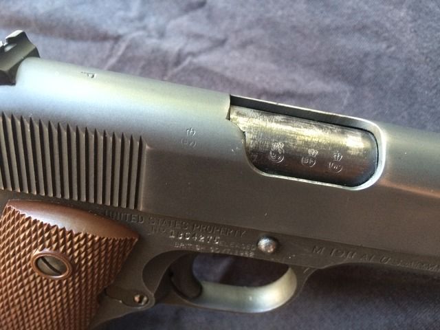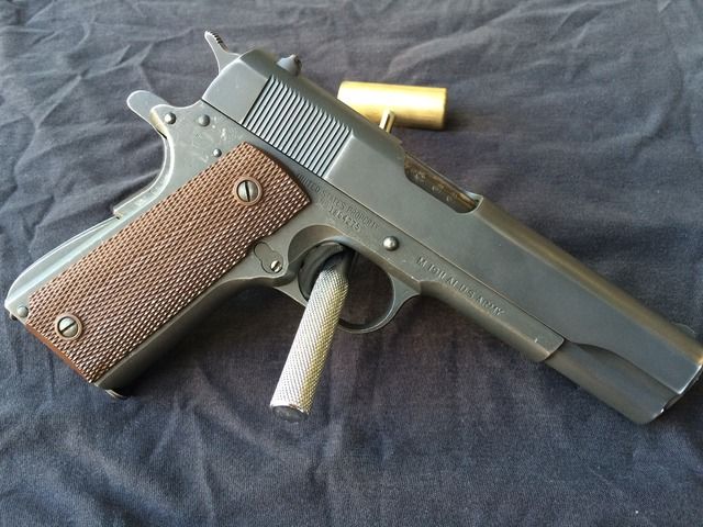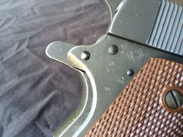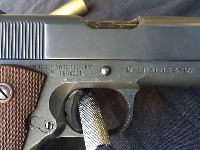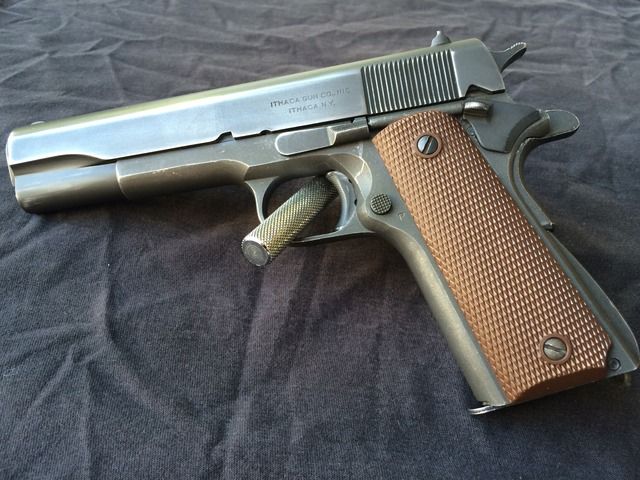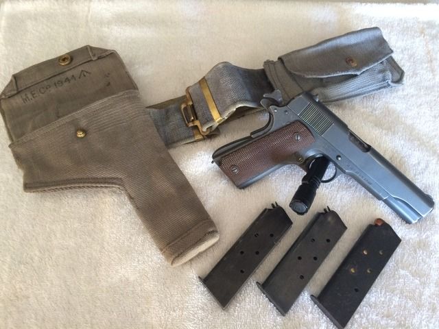 1944 Ithaca M1911-A1 "British Lend-Leased". One of the nicest examples I've seen around. This was purchased from a private collection in Glendale, CA. Very few of these 1911's were actually issued to British troops, and the ones that did mostly went to officers. This particular 1911 includes a British RAF (Royal Air Force) issued P-37 canvas belt, carlisle pouch and Webley holster (the most commonly used holster by the Brits for the 1911's) which is dated 1944, matching the pistol. Also included is three WW2 USGI magazines. No pitting or rust issues. Not hurting for cash, so my price at this time is firm.