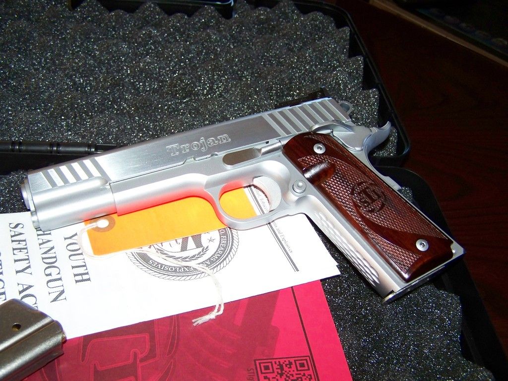 For sale is an STI Trojan 1911 9mm in Hard Chrome with Fiber Optic front sight. Excellent condition. Really fun gun to shoot. Flat top, ambi safety, stippled front strap, undercut trigger guard, knuckle relief high-rise beavertail grip safety, front and rear cocking serrations, oversized ejection port, 5 in ramped barrel and full length guide rod. Added Greider precision short trigger and Hogue polymer mainspring housing. I have shot about 800 to 1k rounds thru it. Comes with everything it came with from the factory. Price is $old. Thanks for looking.