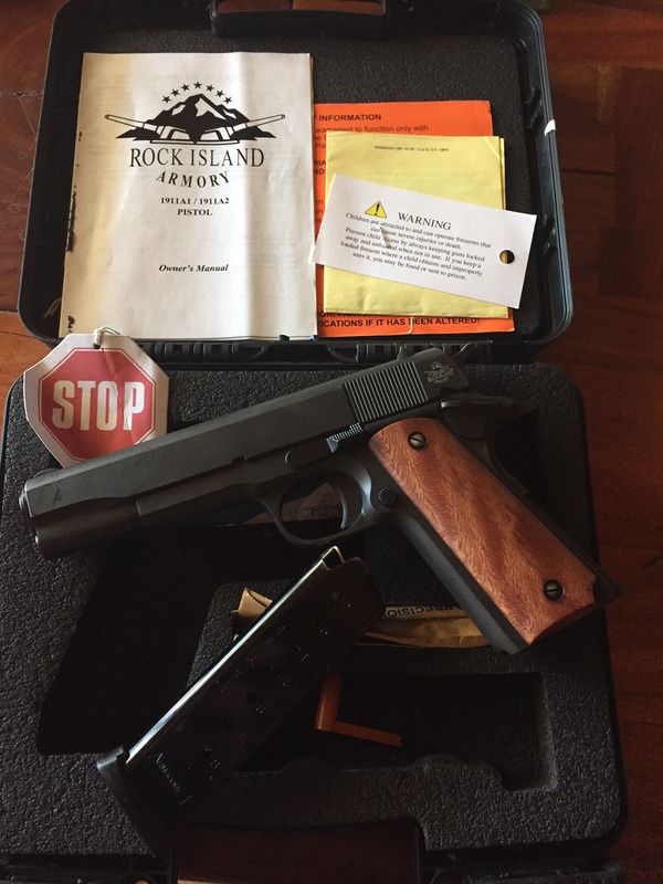 Very gently used with extremely low round count Rock Island GI 1911 in 45 ACP. This is one of the newer ones WITHOUT the huge roll marks on the slide. Comes with one OEM magazine and factory box, With all factory documentation. I ran probably 200 rounds at most through this without any function problems.
