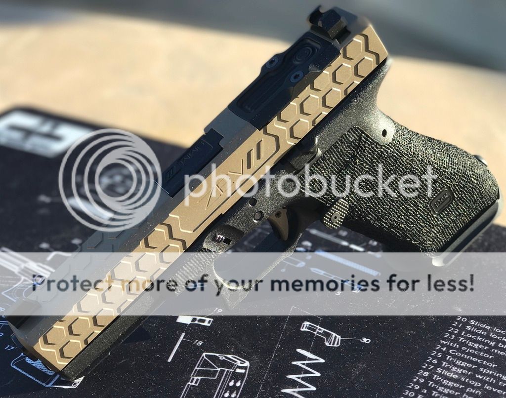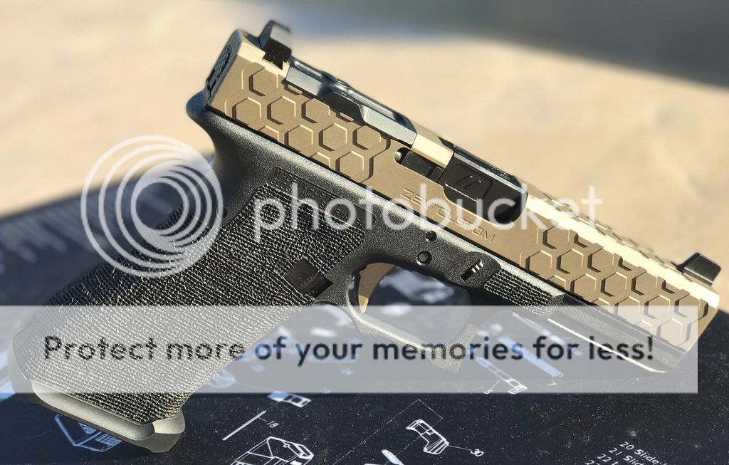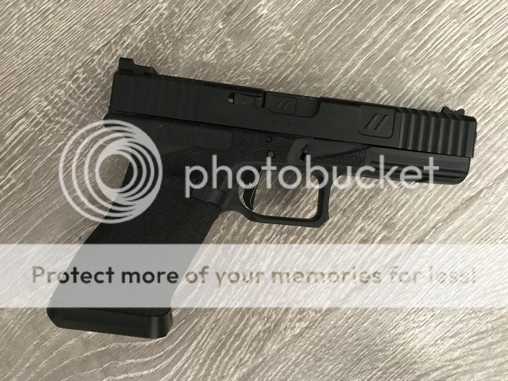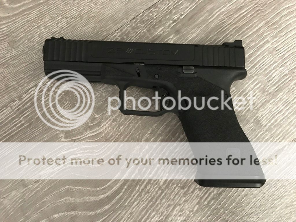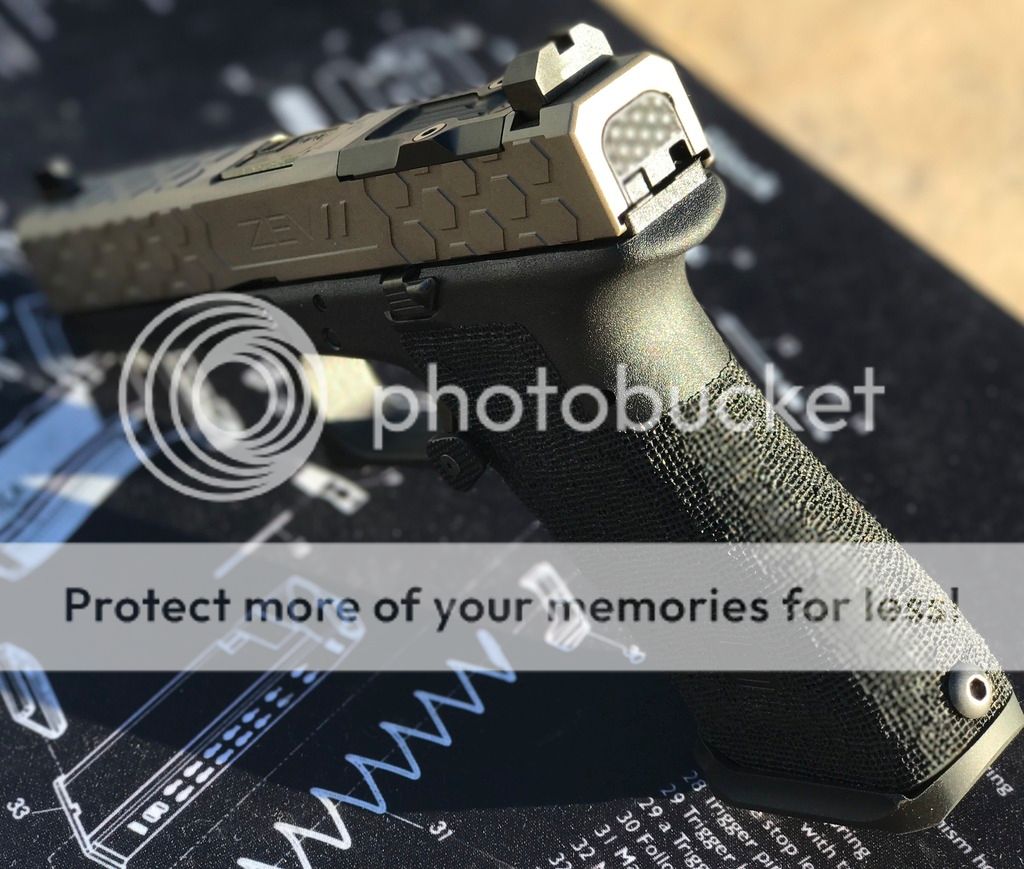 Other info: Slide is a Glock 17 Zev milled Defender slide with Fiber optic Zev combat sights and Black Zev dimpled barrel. Does not have RMR cut but has an American flag milled on top.
