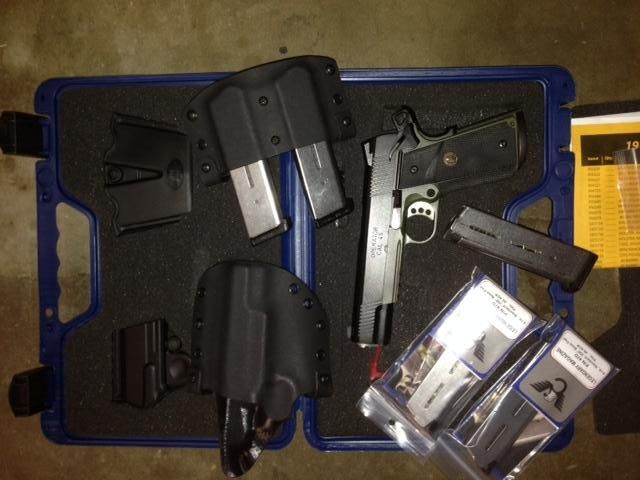 Lightly used (few hundred rounds) MC Operator in like new condition. Includes 5 Wilson Combat 47D 8rnd mags, 2 factory mags JM Custom Kydex OWB holster & 2 mag carrier, S&A magwell straight and factory case and goodies. Its set up for some good fun at IDPA matches although I never competed with it. I will not part out.