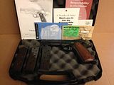 Original Owner, 5" barrel, blue steel, blackwood grips, skeletonized combat hammer and trigger, lowered ejection port, two factory mags, one aftermarket mag, original box, paperwork. some minor holster wear on ridges. appx 500 rds fired, brass only.
