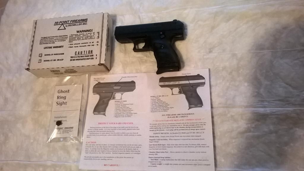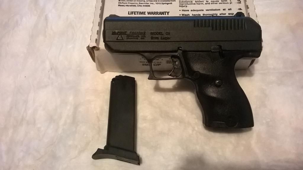 Good condition C9 for sale. It's a Hi Point so you either love it or hate it. I love it but want the carbine. Comes with one magazine, ghost ring sight, box, manuals, and lock. These also have a fully transferrable lifetime warranty. Gun is reliable and accurate. I'm the second owner and have put about 200 rounds through it. Not sure of total round count though. Shoots great! Buyer pays transfer fees. Firm @ $120. Cash only. No trades or offers. Transfer to be done at Iron Sights or Gunther Guns. PM me if interested.