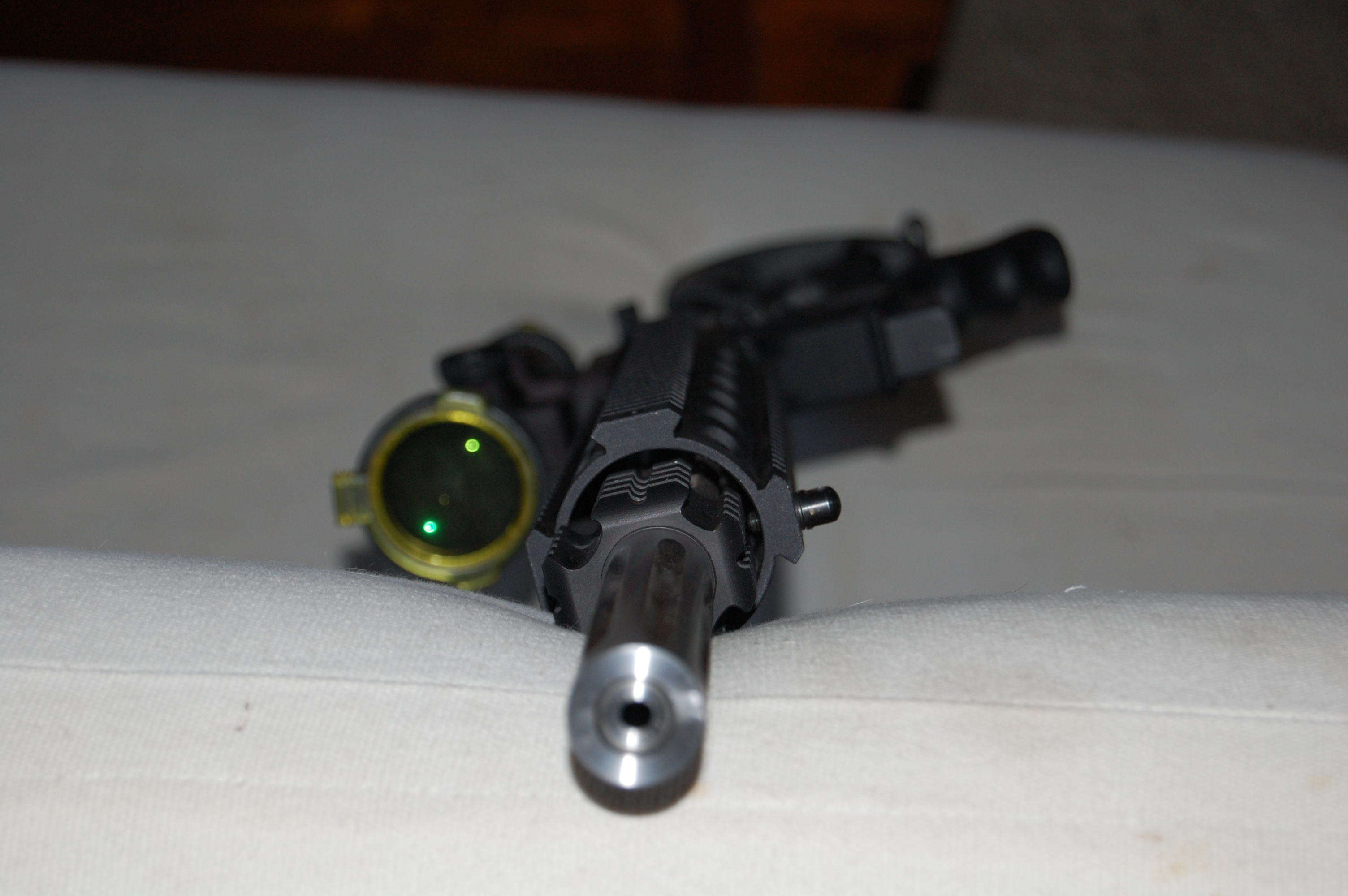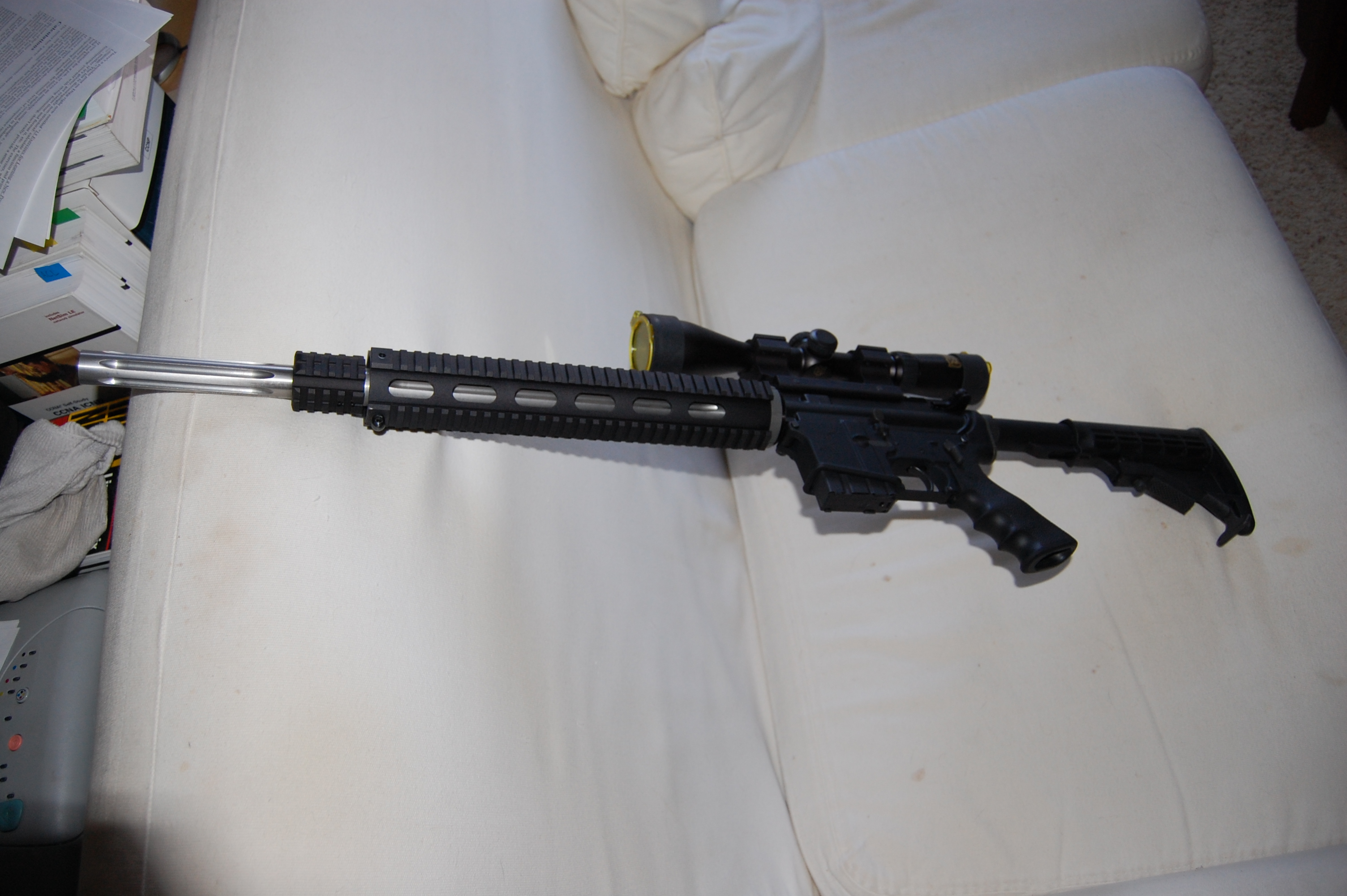 The top is a 20" DPMS railed upper with fluted crowned (I think) barrel. Also included is a Niko Sterling Gold Crown 3-9x42 scope with rail mount.