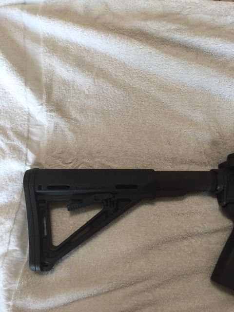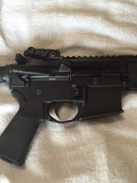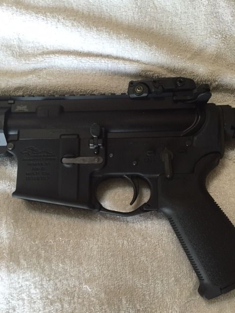 The rifle is an Anderson Lower with an Anderson lower parts kit. It has a Magpul grip and butt stock, I am unaware of the particular model of the Magpul furniture. The upper is a 16" 5.56 PSA upper. It has Magpul MBUS sights front and rear. The rifle was built around last December. It has a bullet button and will come with one 10/30 magazine. The lower has a small blemish from when it was built. It can be seen in the first photo I post as the shiny spot where the finish got hit. It is the lower far right corner of the magwell. This rifle has seen one range trip with about 100-120 rounds put through it.
