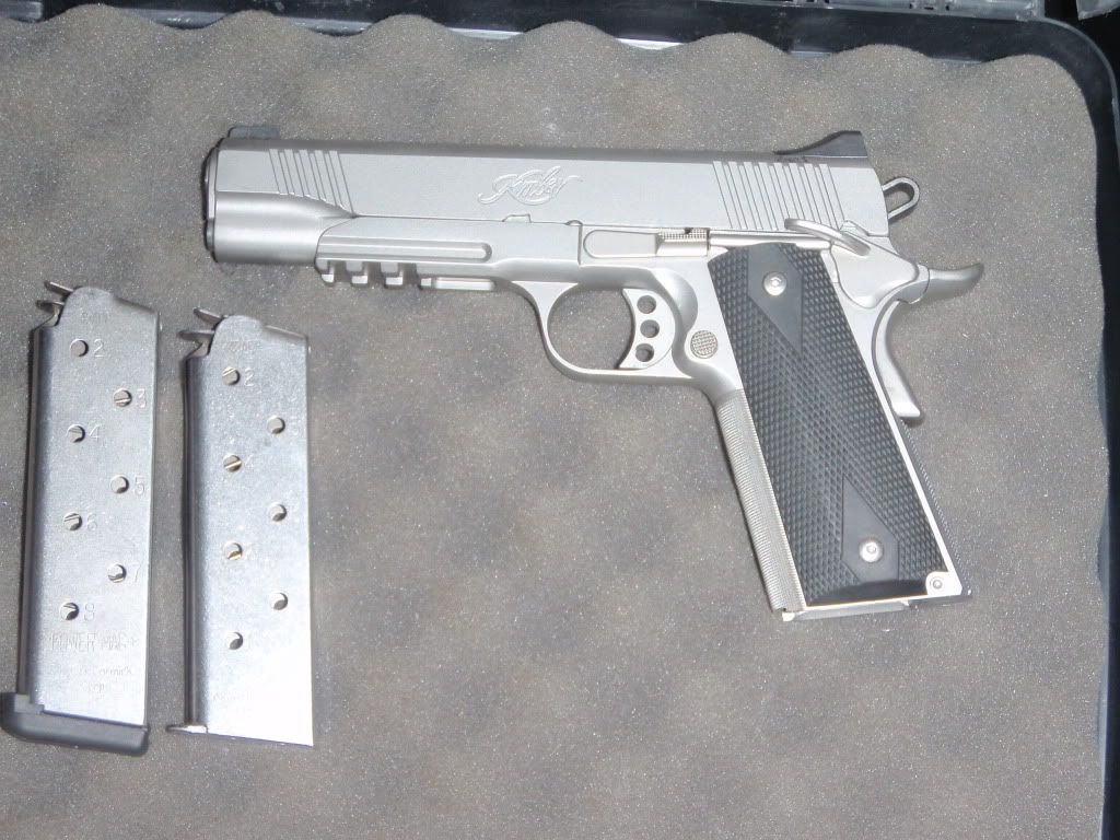 Stainless Kimber TLE II with tactical rail, factory meprolight night sights,