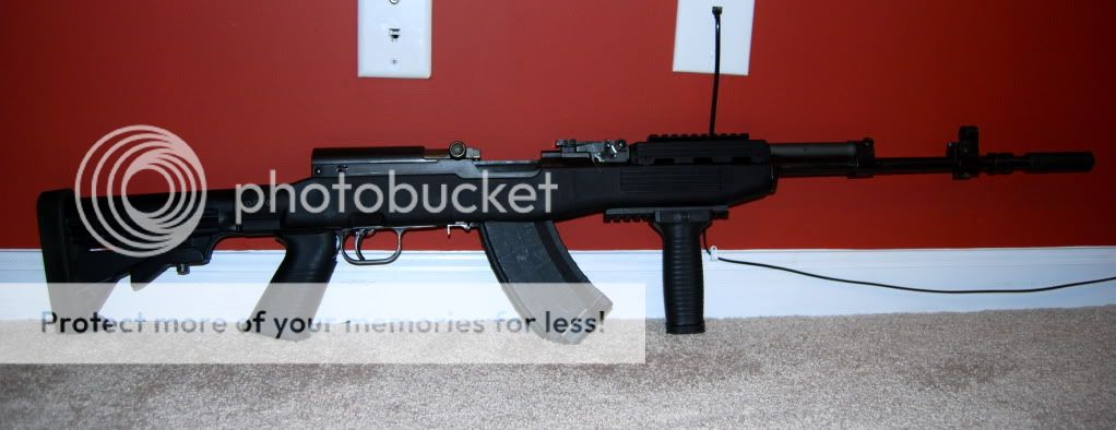 Tapco stock,10/20 fixed mag,gas tube,VFG & muzzle break. Bayonet lug and launcher sight removed.