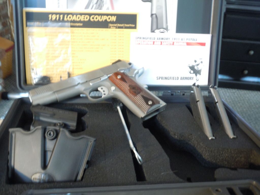 WTS NIB .45 springfield "loaded" model, s/s, never fired except by factory, has slight idiot mark from "teaching" grandson how not too. need $ quick so....$800.00