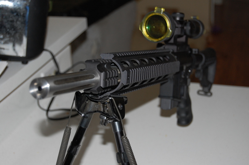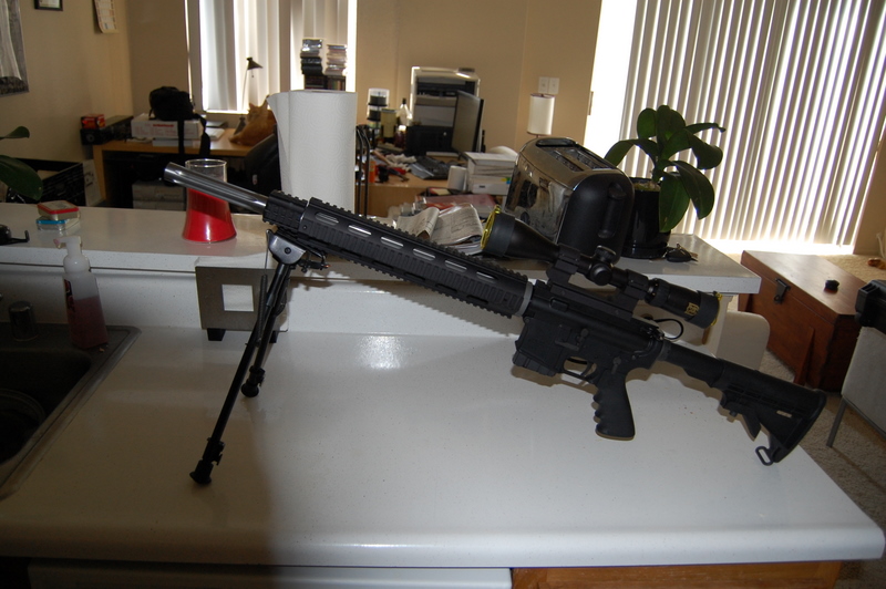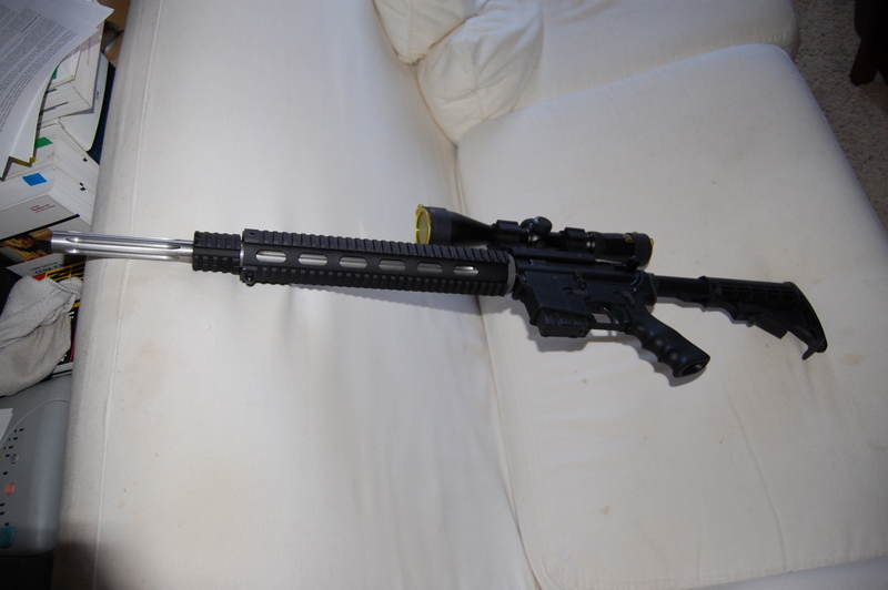 For sale is a 20" AR. Lower is a Stag with a DPMS parts kit, unknown-brand collapsible stock, prince-50 maglock and houge grip. Upper is a 20" DPMS fluted bull barrel upper, 1/9 twist with quad rail fore-end. Also included is a Nikko Sterling 3-16 scope (but no rings). I'm keeping the scope rings in the picture. Bipod not included.