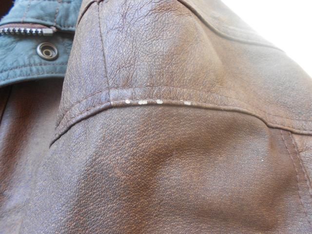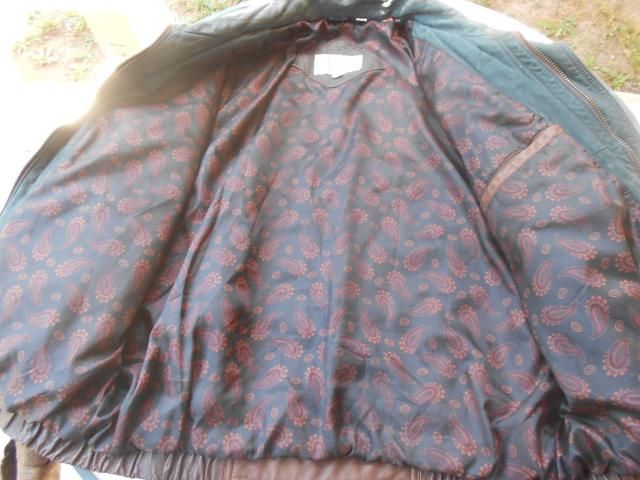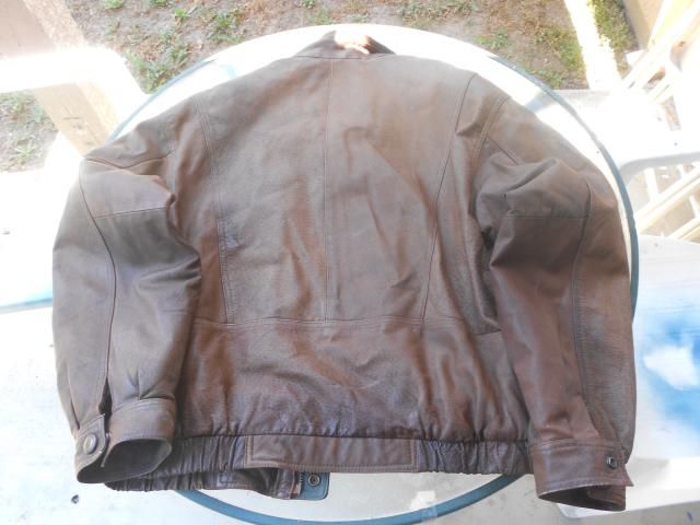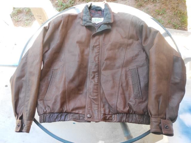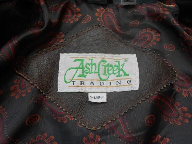 Ash creek genuine leather jacket Size X-large. Zippers work great, minor wear on the sleeve cuffs and shoulders, no tears or cuts, in really good shape. This is 100% REAL cowhide leather, not vinyl, not pleather, this is the real deal. I bought this jacket new about 10 years ago. Non smoker, non smoking household.
