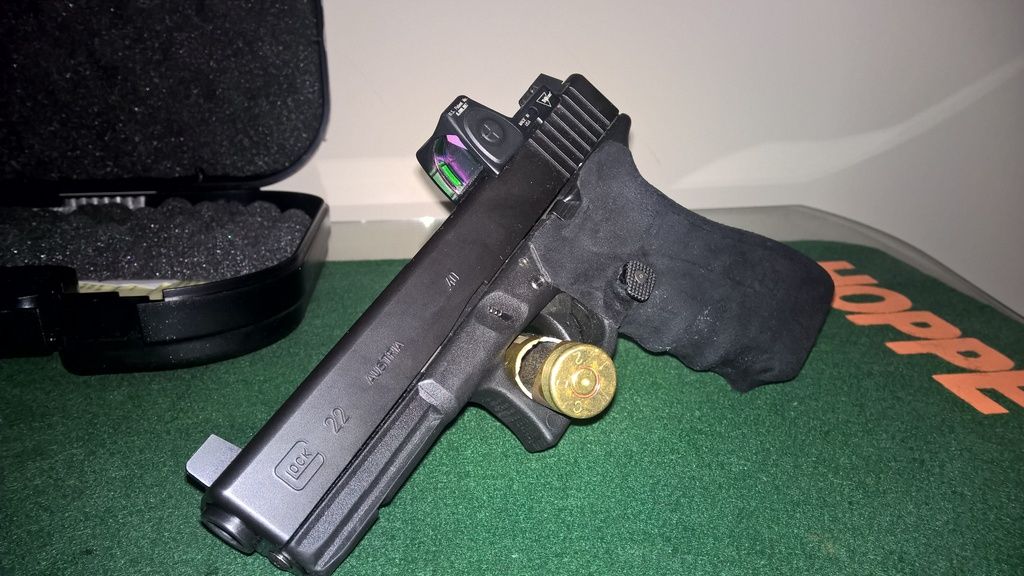 I have a decked out Glock 22, slide milled for an RMR, trijicon suppressor sights, all Zev internals, Zev trigger (black on black), extended mag release, and it comes with the original trigger, case, 5 or 6 mags (need to check)