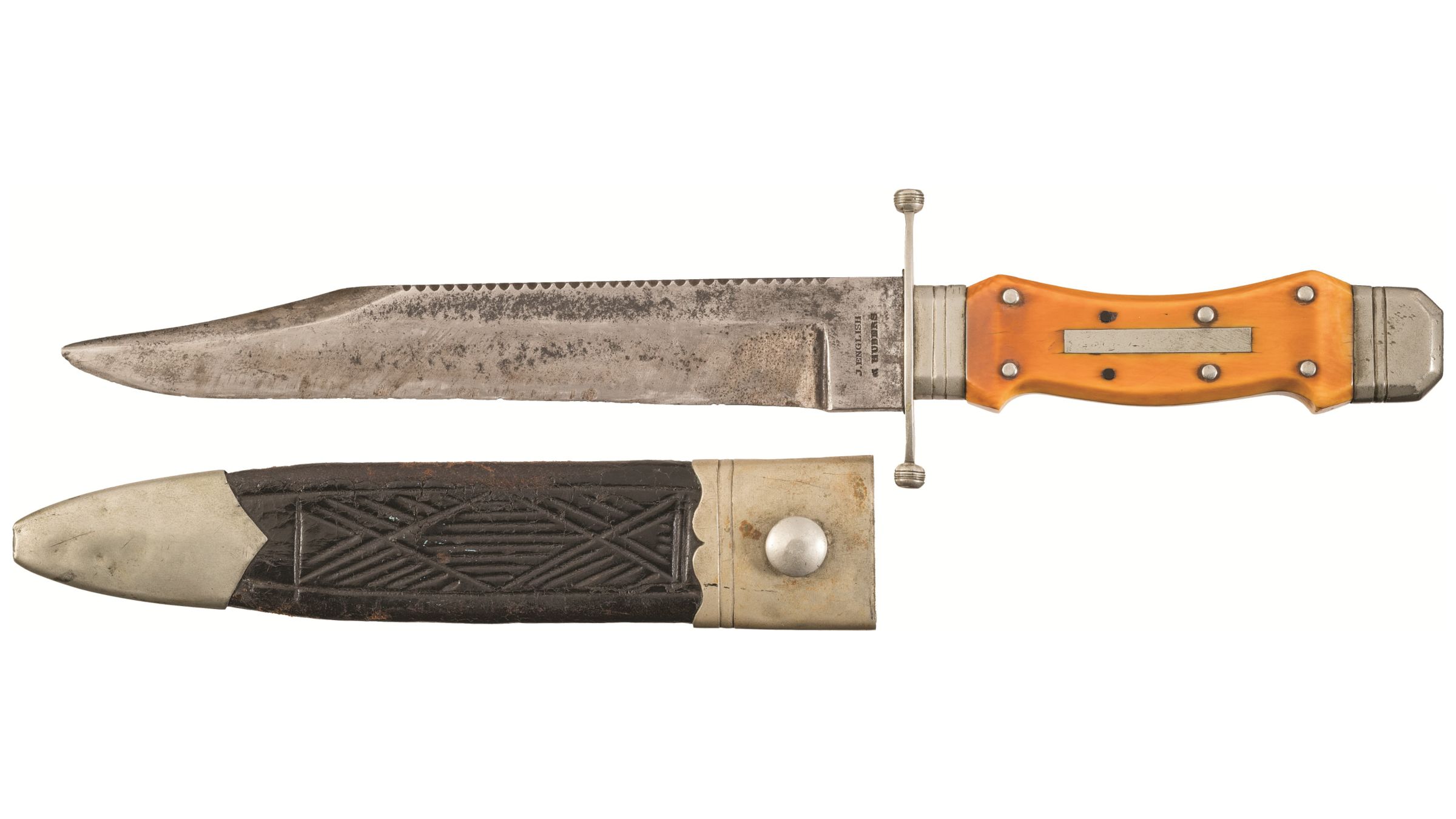 But many knife historians consider that one of the Bowie types made by the J. English and Huber company of Philadelphia is the most likely to be where James Bowie took the knife he had used in the famous Sandbar fight and asked the knifesmiths there to spruce it up. Because his knife was now famous and everyone wanted to see what he was carrying. According to the sources Bowie did that somewhere and it is known Bowie was in Philadelphia with his brother Rezin between 1831 and 1836 (the years that English and Huber was in existence). English and Huber also called their establishment Sheffield Works