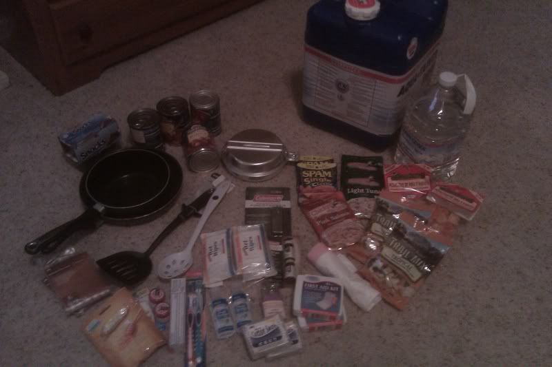 7.5 gallon water container, 4 gallons of water, 4 singles of spam, 4 of tuna, 4 of salmon, trail mix (4), dried fruit (4), soup (4), pudding packs (8), trash bags, band-aid kits (4), cotton swabs (4), nailfile/clippers kit (1), hand sanitizer (4), wipes (6), flint stone, water drops (says for 24 quarts), 4 toothbrushes, toothpaste, floss (4), lip balm (4), cough drops bag, 4 ponchos, camping aluminum cook set, spatula, slotted spoon, and 2 used cooking pans
