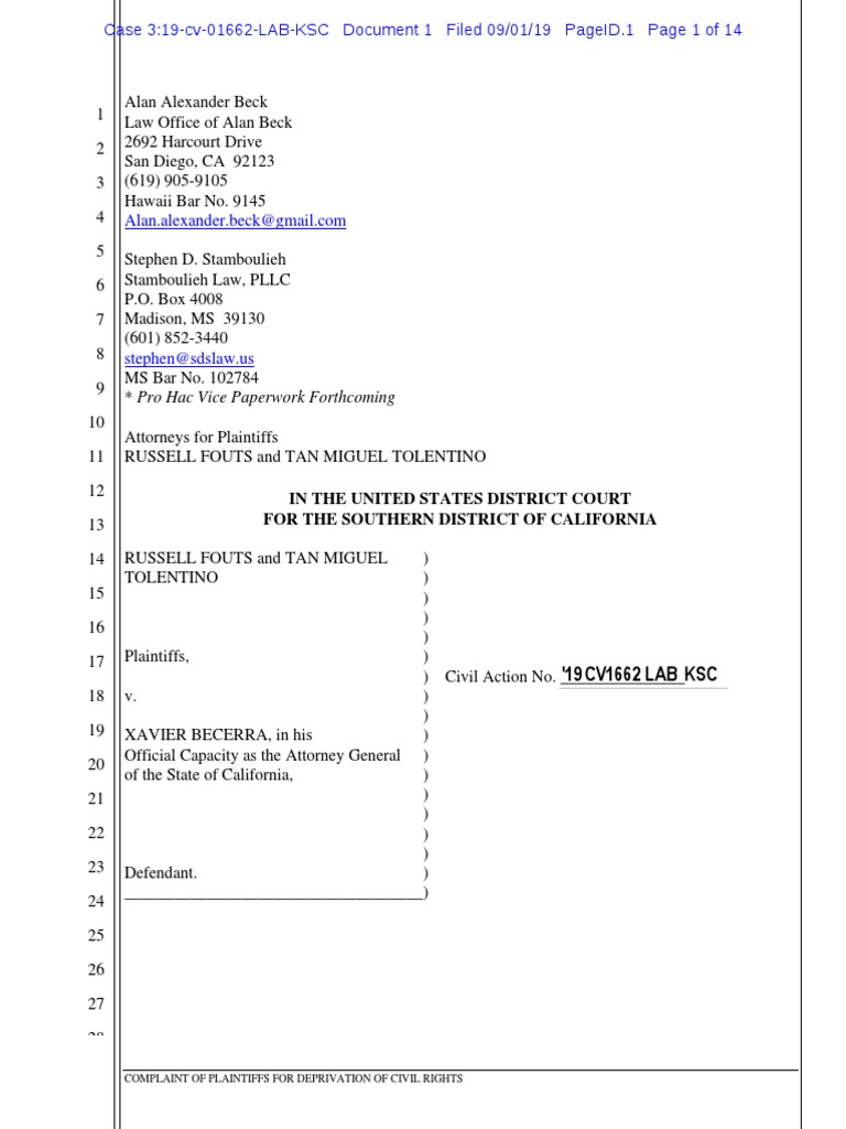 Doesn't the lead attorney have to be admitted to the CA bar (all I saw was a HI bar #)?A Second Amendment challenge to California's ban on batons got filed today