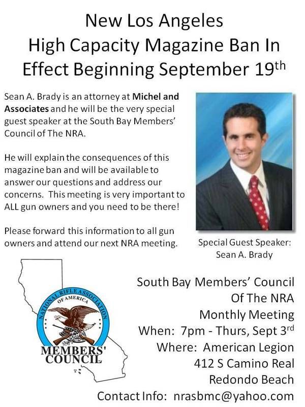 Our guest speaker this month will be SEAN BRADY from Michel and Associates! California #1 law firm in firearm arms law. Sean was at the Los Angeles City Council meeting last month when they voted to ban the possession of "high capacity" magazines. Sean is a member of our NRA legal team that will be filing a law suit to have this ban overturned.