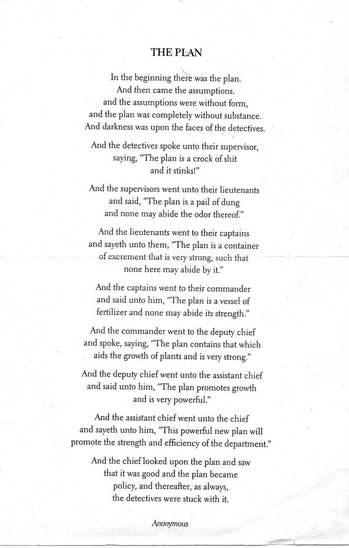 And that is pretty much how it works. I can remember a LT that was trying to sell us a bunch of BS about how great some new stupid screwed up policy that the Chief came up with was. I told him that we are all adults here, why can't you just tell us the truth, that the policy is screwed up but we are just going to have to deal with it until the Chief sees that it isn't working and changes it back. He just looked at me and shrugged his shoulders.