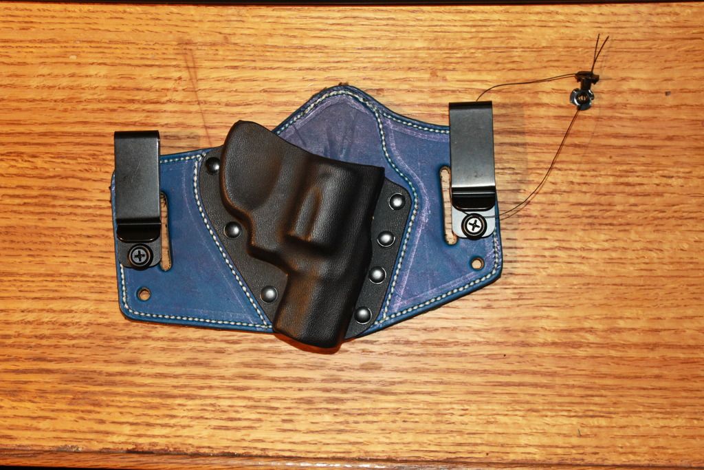 In the art of the possible I had two holsters made. The first fits a Colt Mustang Pocketlite and features a blue jean blue leather backing, and blue jean style white thread. This holster can be worn IWB using the supplied clips, or OWB on a belt.
