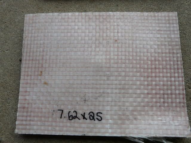 I took a trip up to the hills today and thought I'd bring along some scraps of Bullet-Board from work to test out. This stuff is some sort of Kevlar/fiberglass laminate about half an inch thick. We use this stuff to line rooms where one might fear gunfire like courtroom walls, certain rooms in hospitals, etc. I was told it would stand up to a .357 mag, I don't have one of those so I tried a couple of other things.