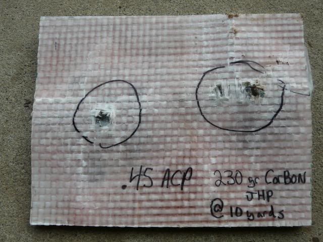 My .45 wouldn't go through with the +P Corbons ( now I'm not sure of the weight of the bullets since I've had them in a mag for a few years but I think they were 230s) I had which is what I expected but was surprised when my CZ-52 wouldn't either after I had heard all the stories of it's armor penetrating abilities.