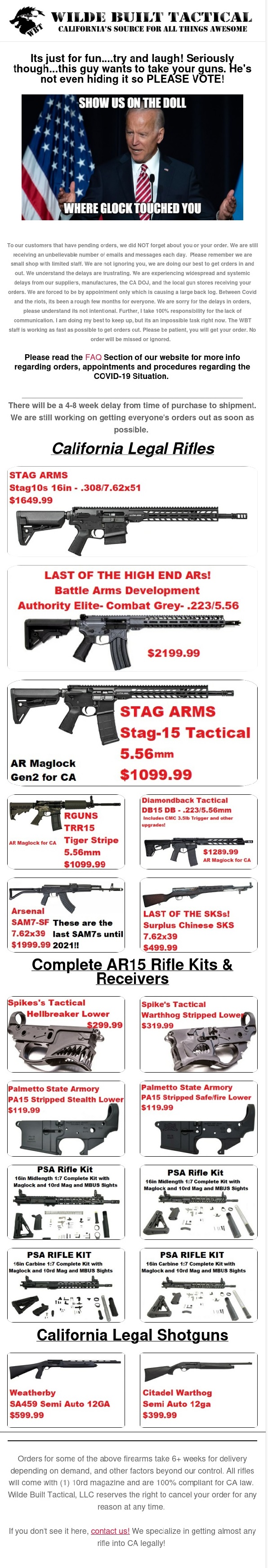 It wasn't an email, its the terms and conditions at check out. Its required to be acknowledged by the customer before payment is submitted. Yes, we had those 2 Rugers in stock, sitting with the other 2000 or so items in the back. WBT is a small family run shop, not Amazon. We are up front about lead times because we are behind with shipping and DROS appointments, and there are about 10 different reasons that need not be addressed, it is what it is. We are up front in every possible way before a customer can spend a dime with us. I'm sorry your friend had to wait so long, its not intentional. Go to our check out page and see for yourself. It don't now how to be more clear on where we are at.My friend just purchased two Ruger LCR 9 mm that they advertised in stock approximately 3 weeks ago and they still haven't shipped. When he contacted them he was told it's 6 weeks because of a ridiculous email stating about unsure times and covid blah blah blah. So is it really a 6-week shipping time wilde built for items that are in stock?sigpic